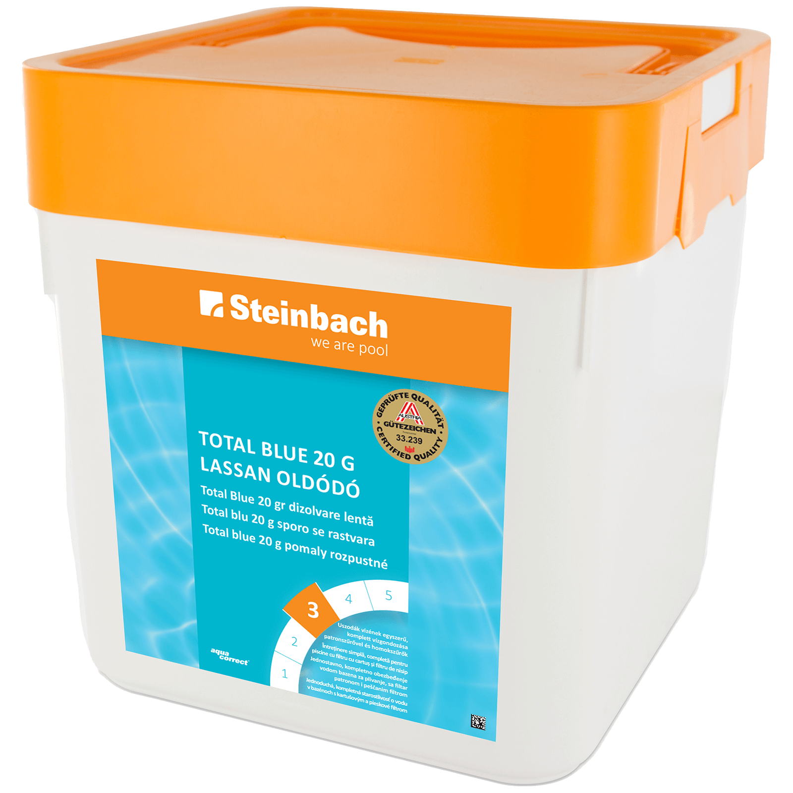 A Total Blue egy vízápolási termék fertőtlenítésre és algásodás megelőzésére. Lassan oldódó multifunkciós tabletta hosszú távú adagoláshoz patronos szűrőkhöz és homokszűrőkhöz. Akvamarin színezéket tartalmaz, hogy a víz kristálytiszta maradjon.