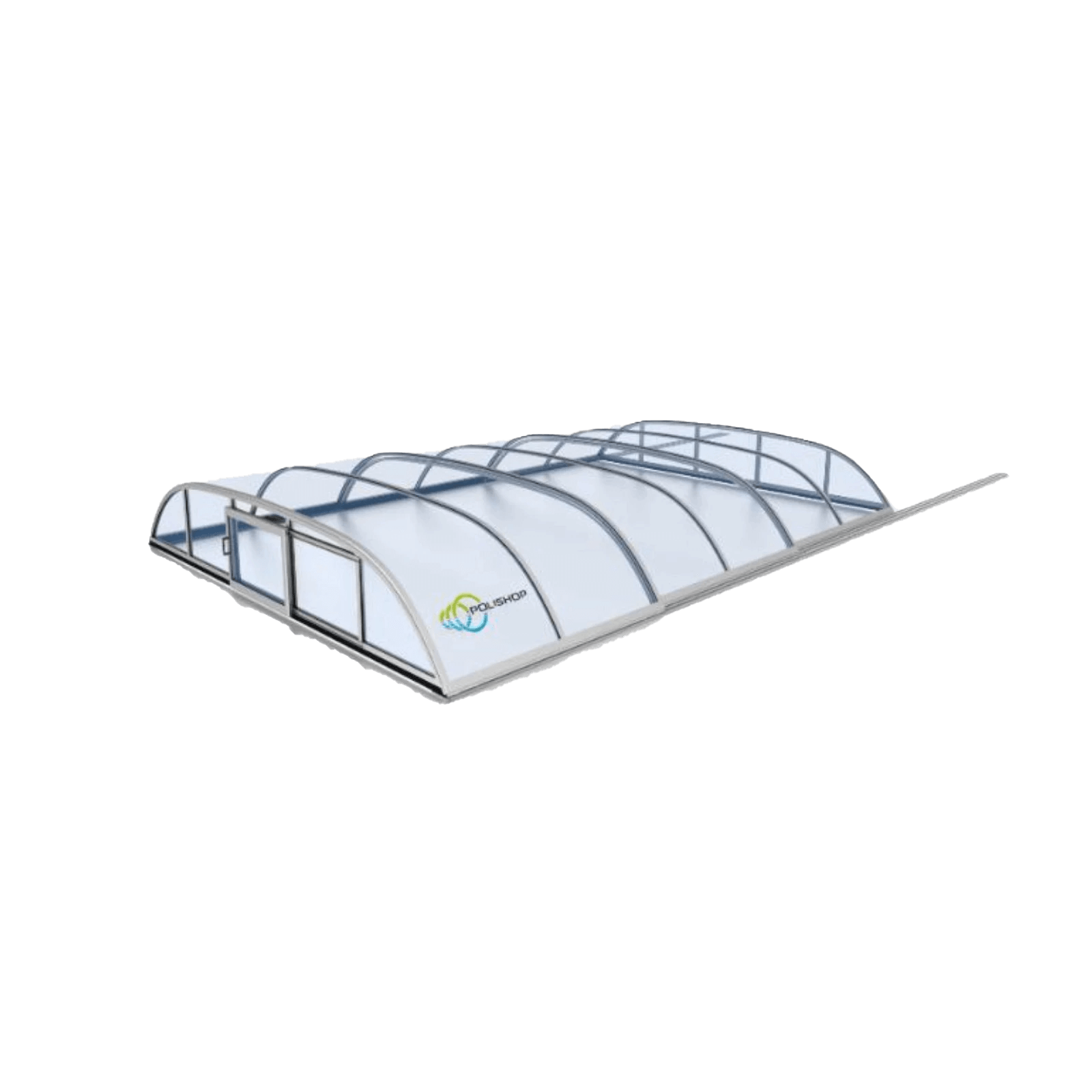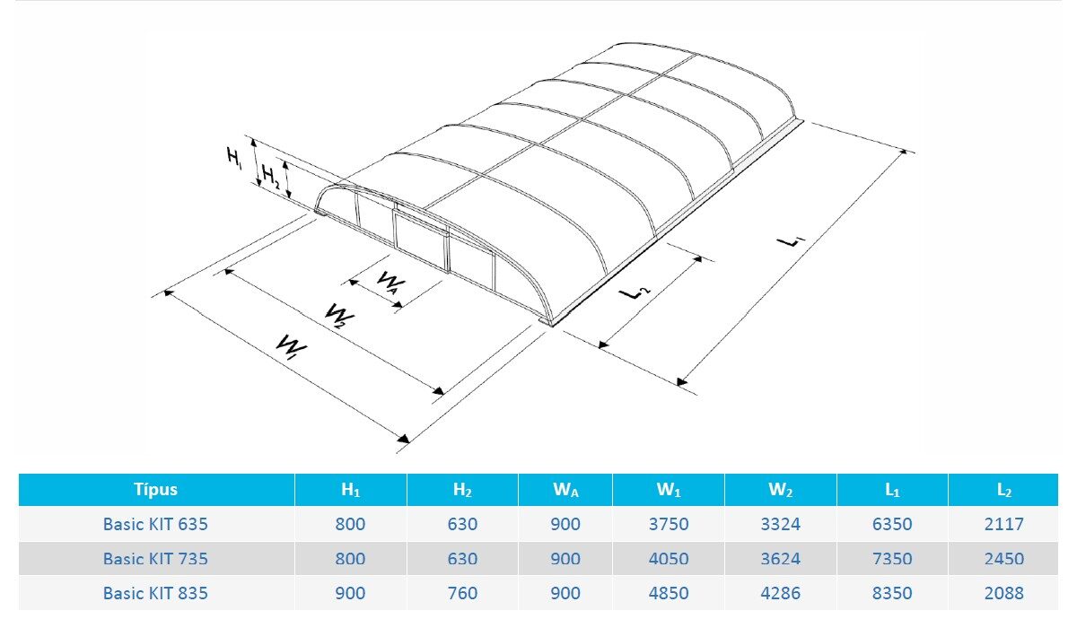 A Basic KIT alacsony kosárgörbe ívelésű medencefedés 3mm víztiszta kompakt polikarbonát üvegezéssel. Eloxált alumínium profil, 14 mm magas sínpálya. Homlokfalon nyitható ajtóval.