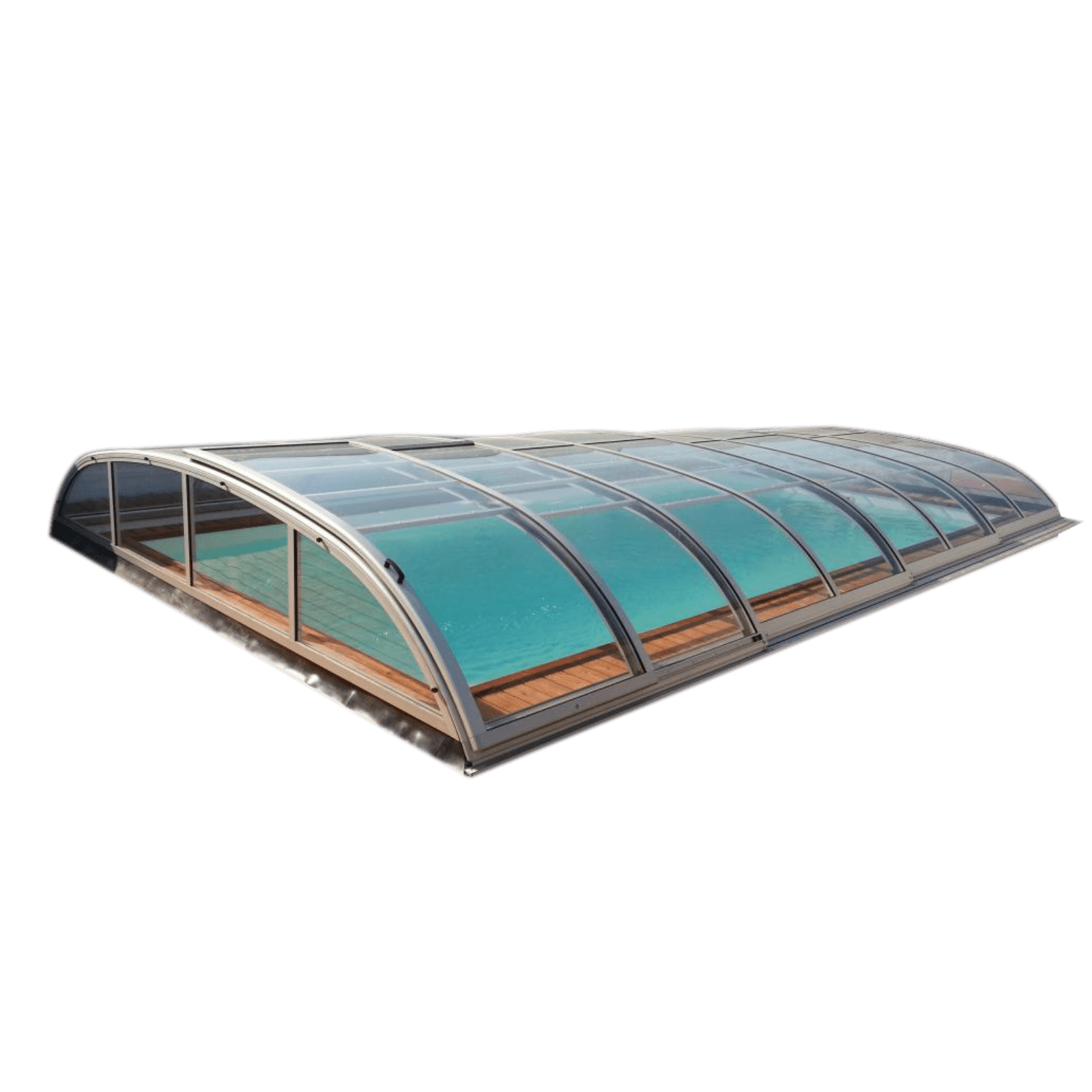 A COMET T KIT alacsony kosárgörbe ívelésű, antracit színű medencefedés 3mm víztiszta kompakt polikarbonát üvegezéssel. Eloxált alumínium profil, 14 mm magas sínpálya. Legnagyobb szegmensen jobb-bal tolóajtóval.
