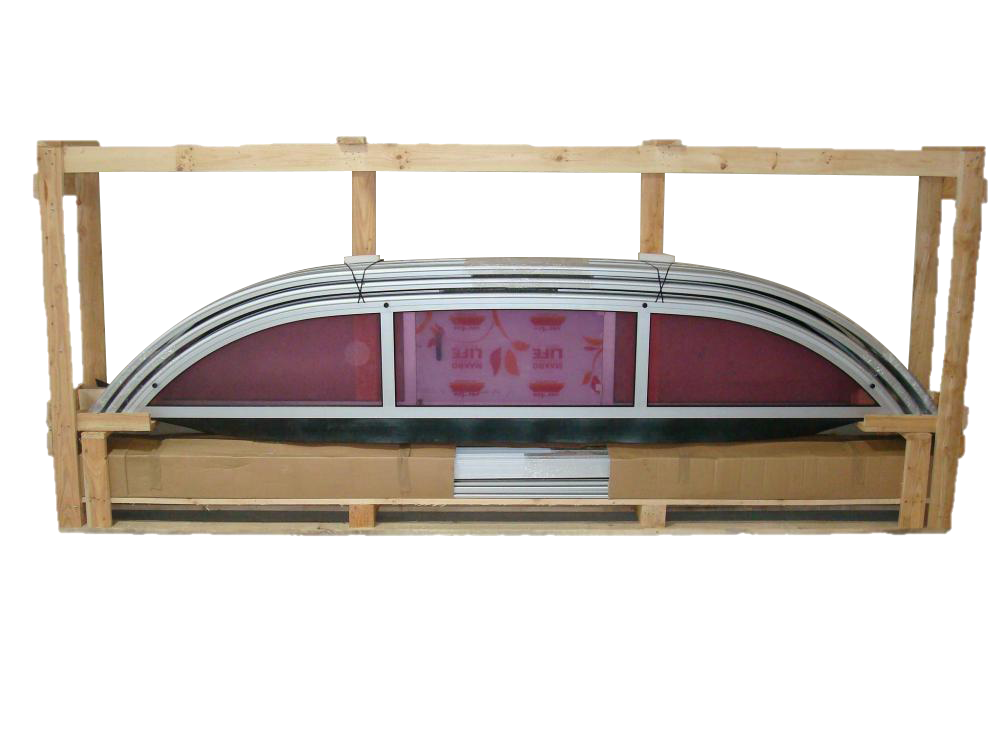 A COMET A KIT alacsony kosárgörbe ívelésű medencefedés 3mm víztiszta kompakt polikarbonát üvegezéssel. Eloxált alumínium profil, 14 mm magas sínpálya. Homlokfalon nyitható ajtóval