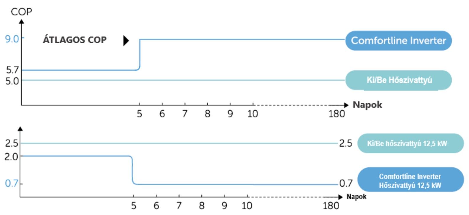 A Comfortline Inverter medence hőszivattyú átlagos COP értéke 9; 26°C levegő / 26°C víz / 80% páratartalom esetén. Ez azt jelenti, hogy 1kW villamosenergia fogyasztással akár 9 kW hőenergiát termelhet, szemben a Be/Ki kapcsolásos hőszivattyú 5kW hőtermelésével, mivel annak COP értéke csak 5 körüli.