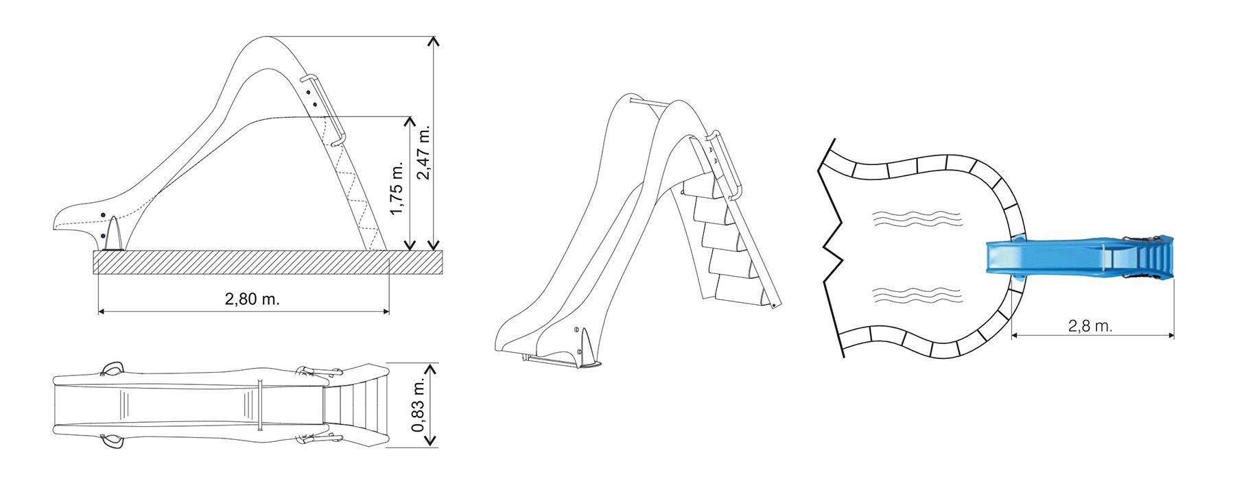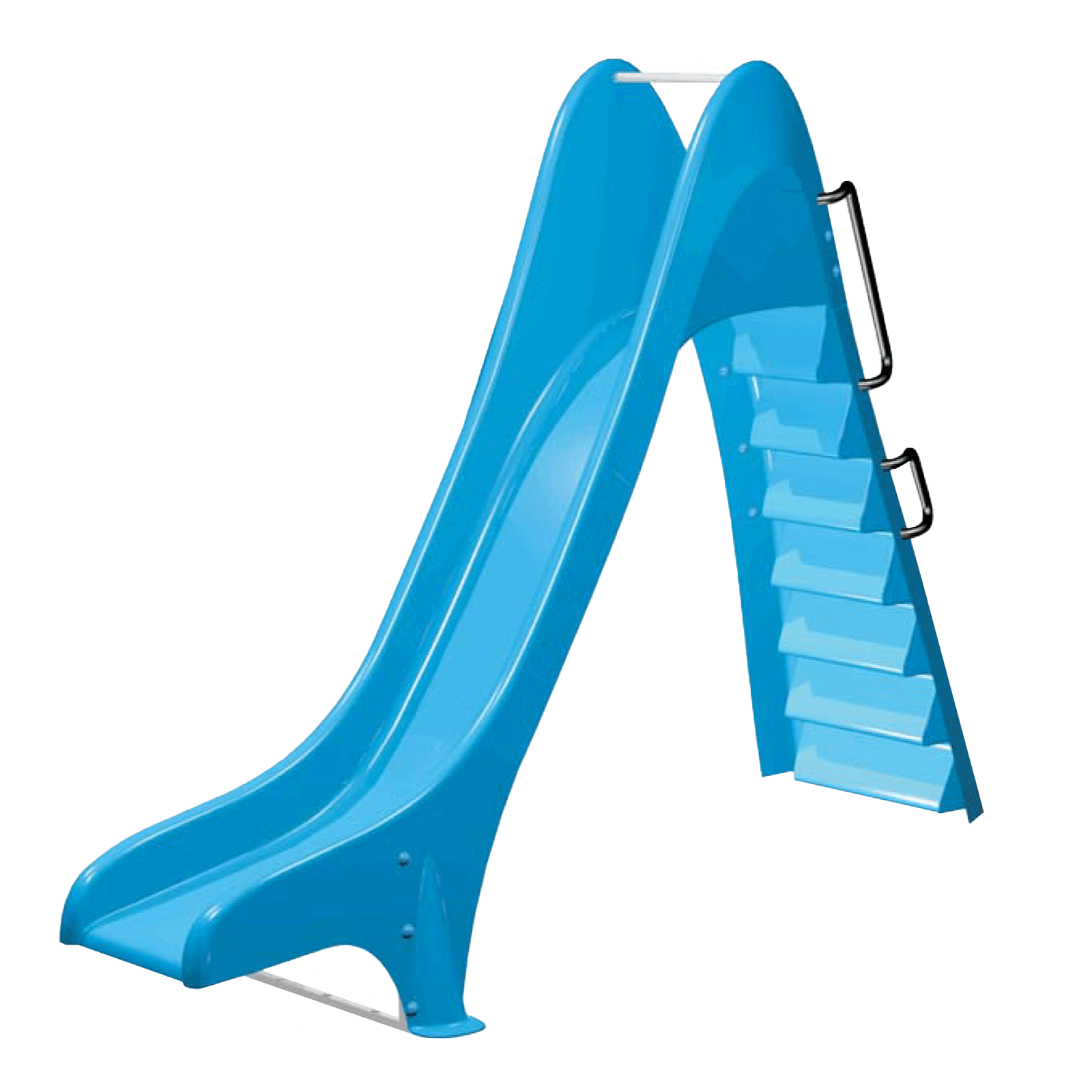 A biztonsági korlátból kijövő vízköpők felelnek a csúszdarész nedvesen tartásáért. Csúszásmentes lépcsőfokokkal és alumínium fogantyúkkal ellátott lépcsők.