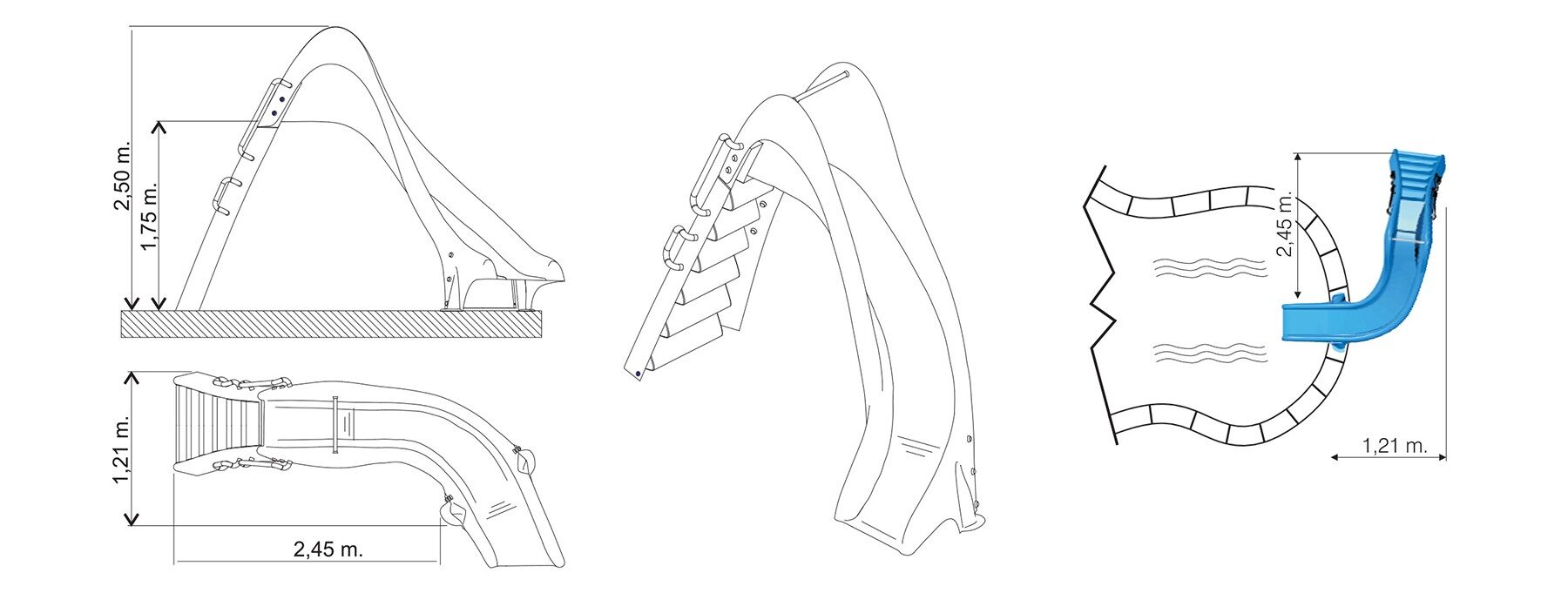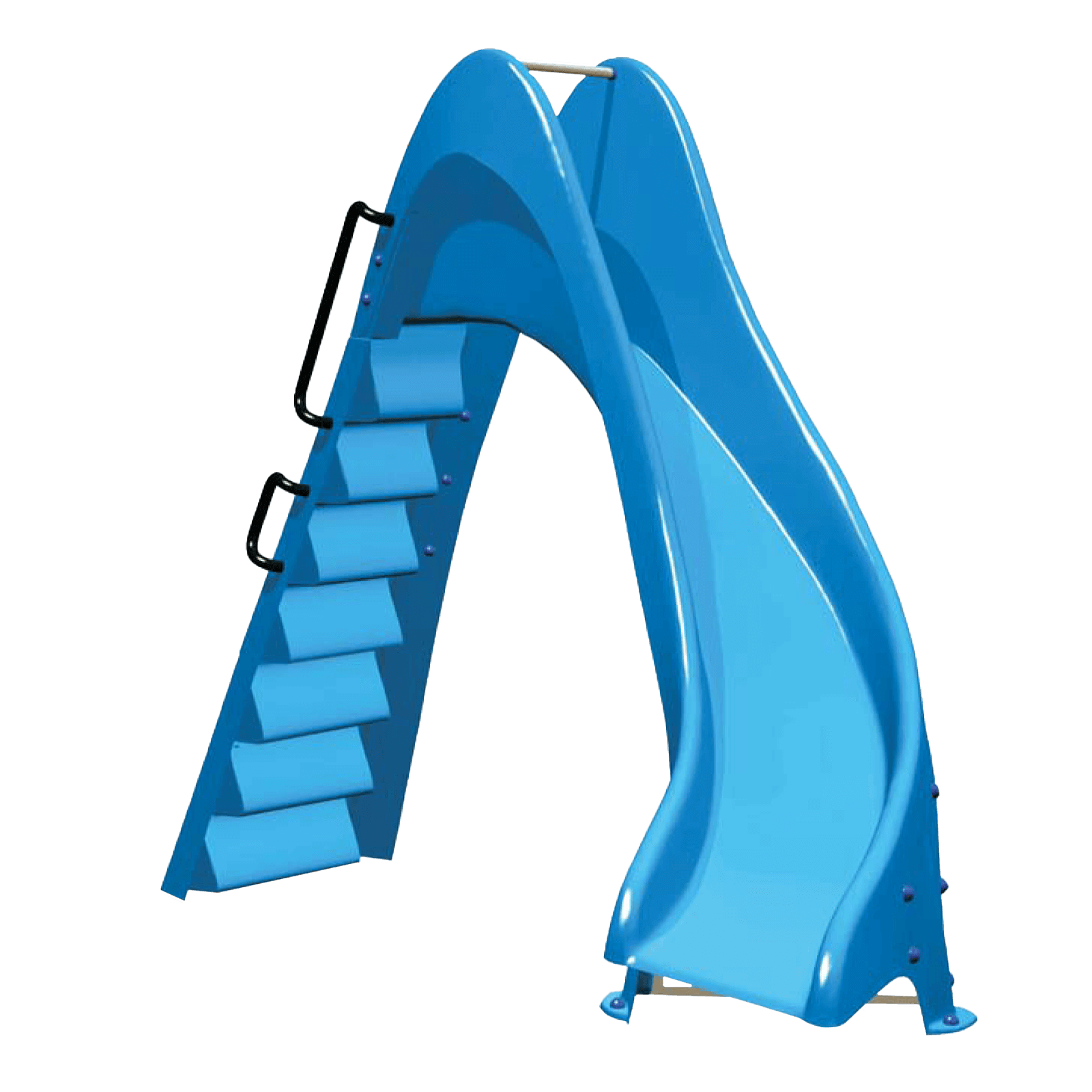 A biztonsági korlátból kijövő vízköpők felelnek a csúszdarész nedvesen tartásáért. Csúszásmentes lépcsőfokokkal és alumínium fogantyúkkal ellátott lépcsők.