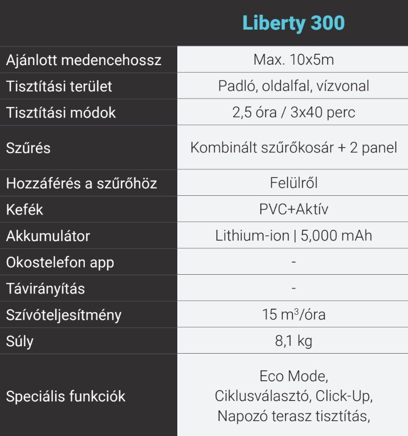 A LIBERTY 300 Eco Mód rövid és hatékony tisztítási ciklusokkal egész héten tisztán tartja medencéjét. Míg a ciklusválasztó segítségével választhat a padló vagy a padló, oldalfal és vízvonal tisztítása között.