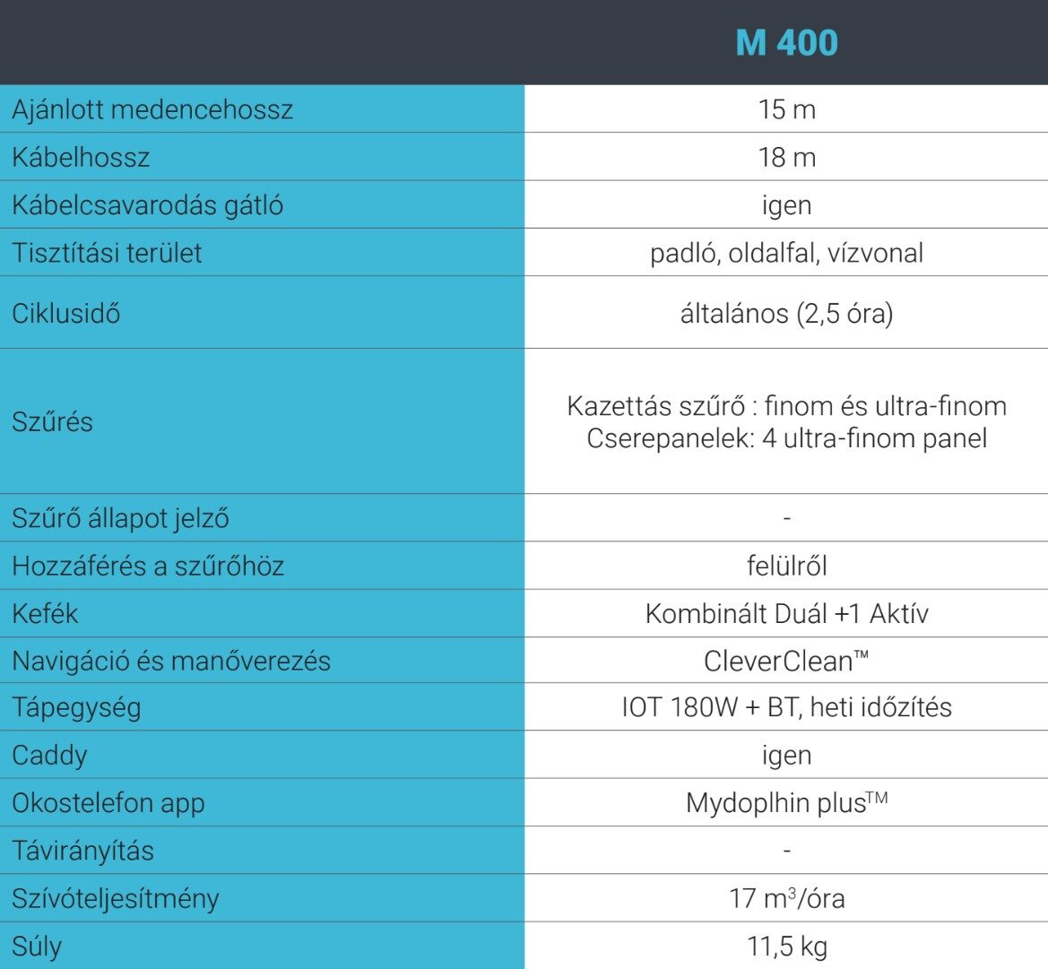 A Dolphin M400 funkcionalitásának és tisztító programjának köszönhetően tökéletes tisztaságot és higiéniát biztosít. Teljesen önálló munkavégzésének eredménye a tiszta medencefenék, falak és vízvonal.