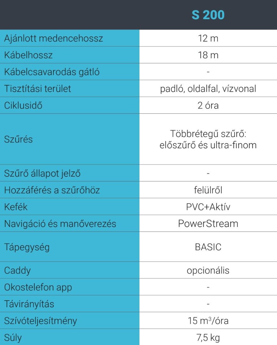 Ultrakönnyű súlyával és a gyors vízkiürítése révén a Dolphin S200 kifejezetten könnyen emelhető ki a medence partjára bárki számára. Kétfajta szűrőjének köszönhetően – durva és ultra finom szennyeződésekhez – tökéletesen tiszta vizet eredményez.
