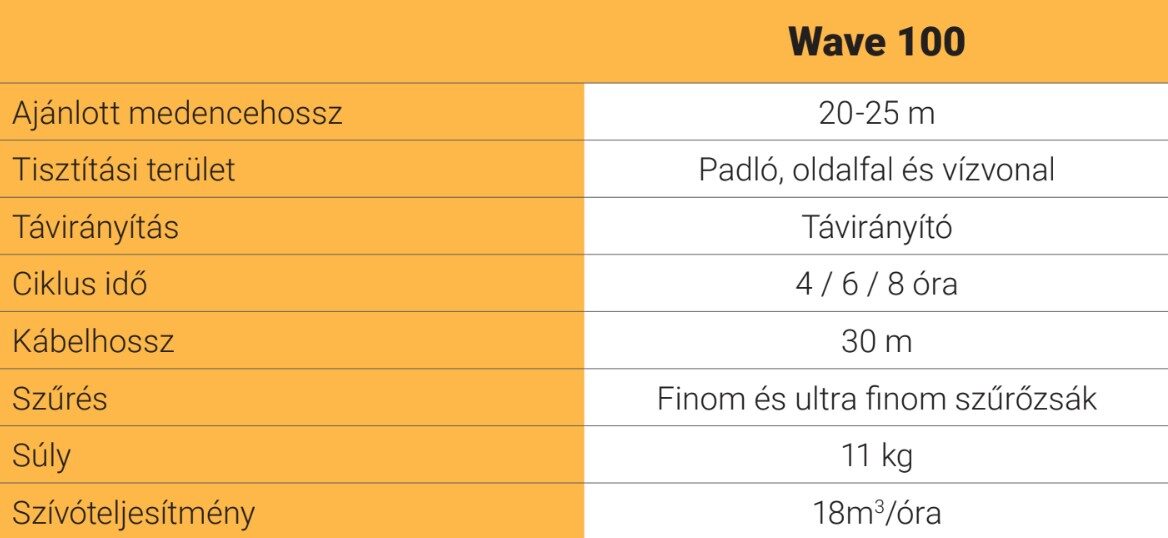 Dolphin Dynamic WAVE 100 CB nagyon hatékony, automatizált medence tisztító a kis- és közepes méretű intézményi medencékhez, 25m-es medence hosszúságig. Professzionális tisztítási teljesítményt nyújt, nagy élettartamú, költséghatékony működéssel párosítva. Fejlett giroszkópos rendszer segítségével tapogatja le a medence egészét, a padlót, a falakat és a vízvonalat. Porszívó – Gyroskop – navigációs rendszere segítségével a medence alját rendszeresen és hatékonyan tisztítja. A nagy kapacitású szűrőtér kiszűr minden típusú szennyeződést, így a medence minden használat után csillogóan tiszta marad. Működési ciklus: 4 / 6 / 8 óra. Korlátlan használat. Súlya 11 kg és 24 hónapos garancia jár hozzá.