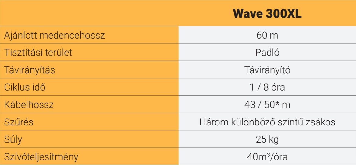A csúcsminőségű, professzionális Wave 300 XL megfelel a nagy vízi létesítmények igényes követelményeinek. Ideális tisztítórobot nagyméretű intézményi medencékhez, olimpiai létesítményekhez, vízi parkokhoz és más helyszínekhez, amelyek akár 50 méteres medencékkel rendelkeznek!