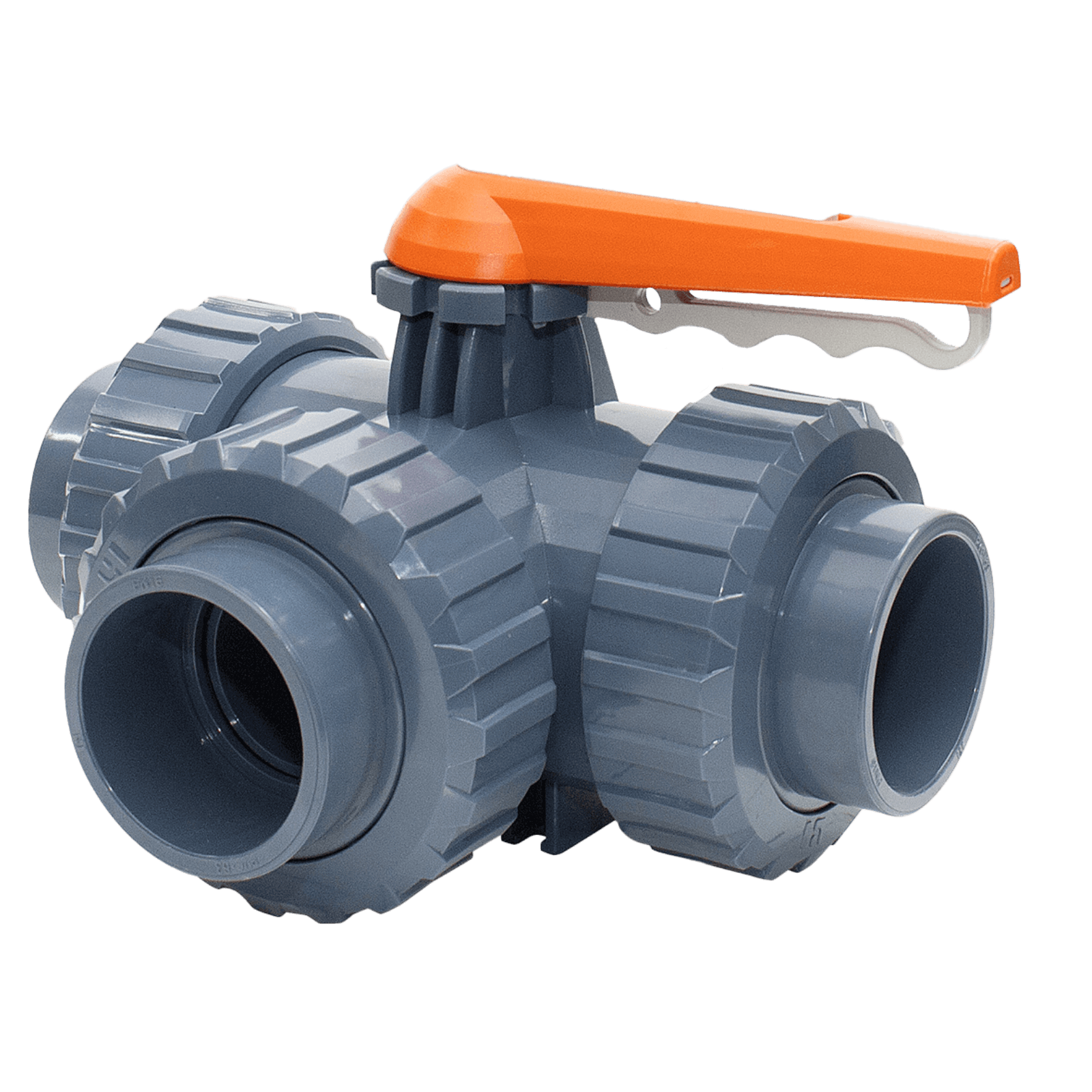 Kiváló minőségű PVC-U 3 utas golyóscsap. A 3 utas golyóscsapok nagyobb rugalmasságot és sokoldalúságot biztosítanak az áramlási útvonalak kezelésében. Hosszú élettartam, kiemelkedő korrózióállóság és kopásállóság jellemzi. Felhasználhatósága egyszerű, összeszerelése praktikus és gyors.