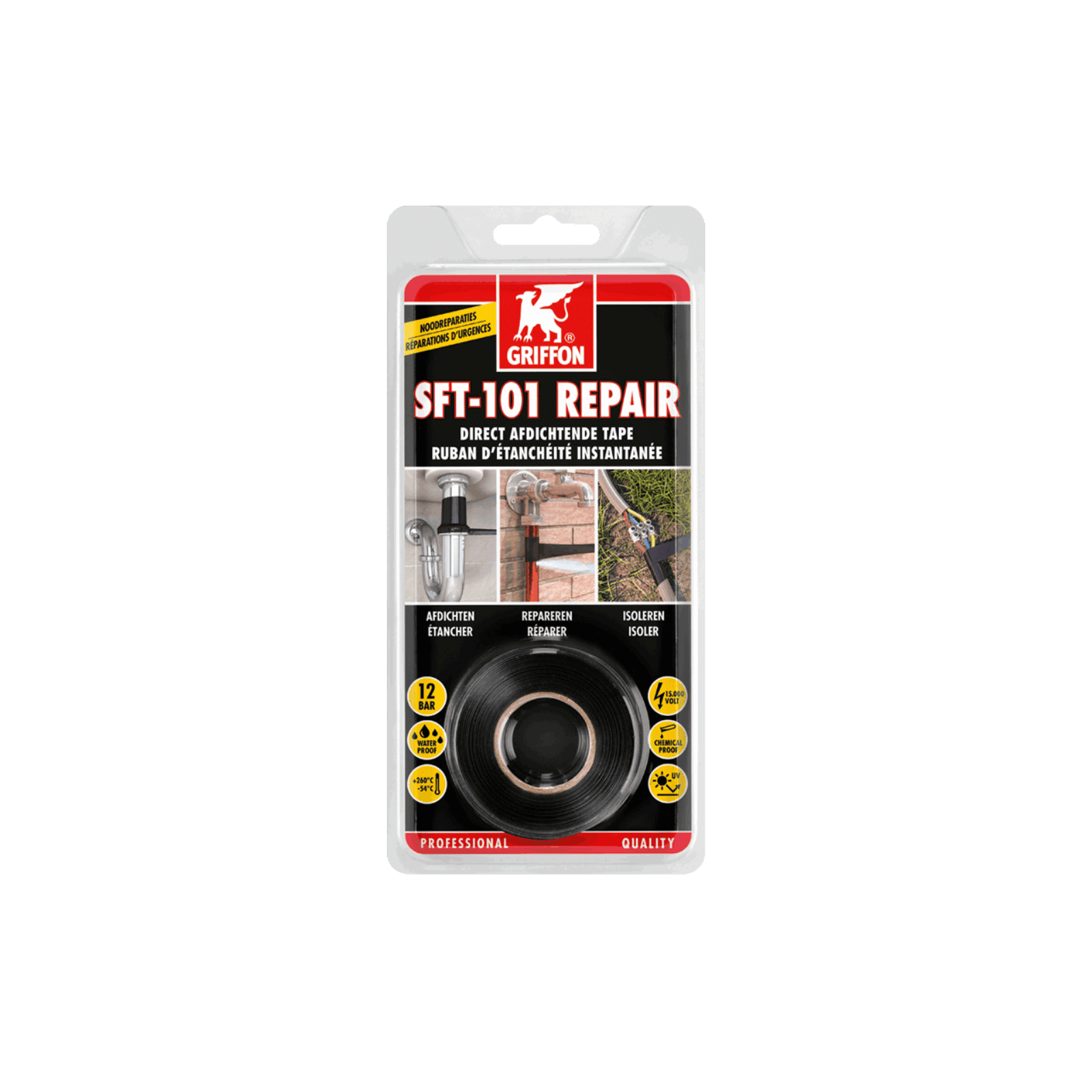 A szalagot kinyújtva és átfedésben saját maga köré tekerve egy szigetelő, víz- és légálló tömítést kapunk. A Griffon SFT-101 Repair azonnal használható és ellenáll akár 12 bar nyomásnak. A szigetelőképessége 15.000 volt rétegenként. A szalag hőálló -54 és