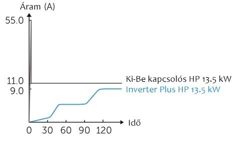 Amikor egy Inverter Plus hőszivatttyú bekapcsol, az áramfelvétel 0A-ról indul és 2 perc alatt emelkedik a szükséges szintre. Ez nem befolyásolja az otthona energiaellátását/rendszerét. Mindez a ki-be kapcsolós hőszivattyúnál nem mondható el, hiszen bekapcsoláskor a szükséges áram 5szöröse a felvételi szint, ami nagy megterhelést ró a ház energiarendszerére.