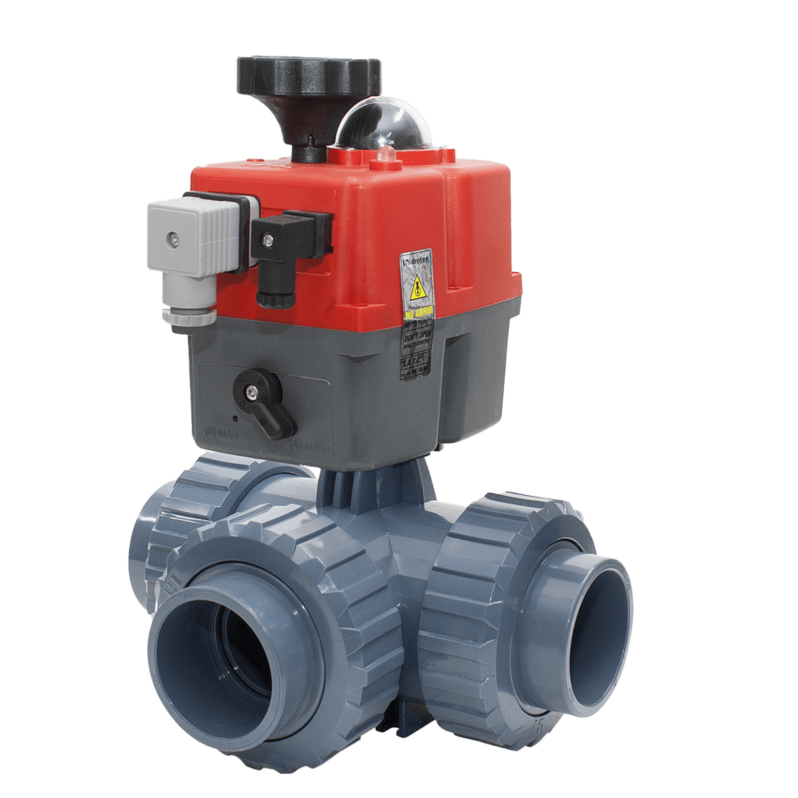 Kiváló minőségű PVC-U 3 utas motoros golyóscsap. A 3 utas golyóscsapok nagyobb rugalmasságot és sokoldalúságot biztosítanak az áramlási útvonalak kezelésében. A motoros golyóscsap egy elektromos motorral felszerelt változata a hagyományos golyóscsapnak. A motoros változatnál a gömb forgatása nem kézzel, hanem elektromos motor által történik. Automatizált működésének köszönhetően egyszerűbben és biztonságosabban használható a golyóscsap. Hosszú élettartam, kiemelkedő korrózióállóság és kopásállóság jellemzi. Felhasználhatósága egyszerű, összeszerelése praktikus és gyors.
