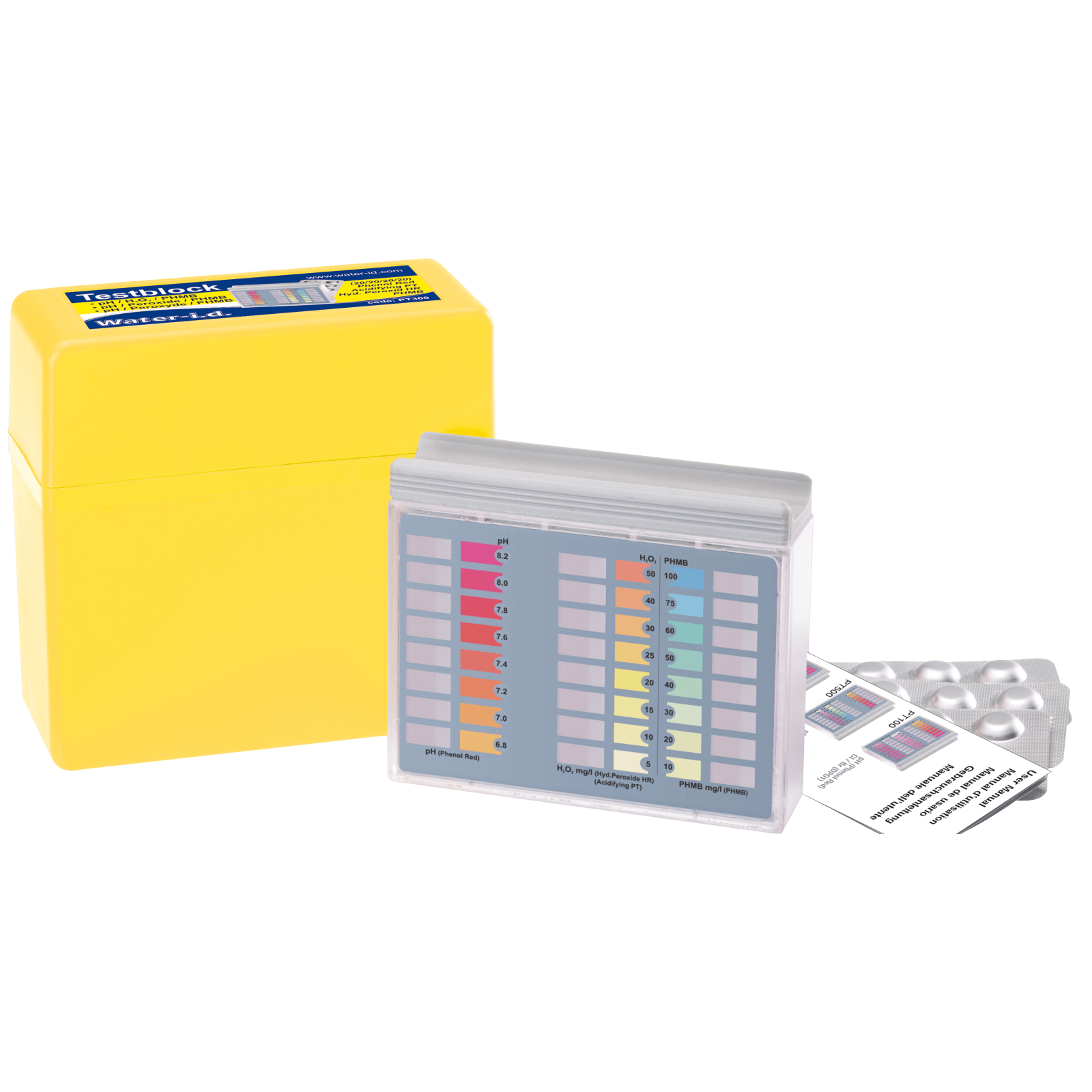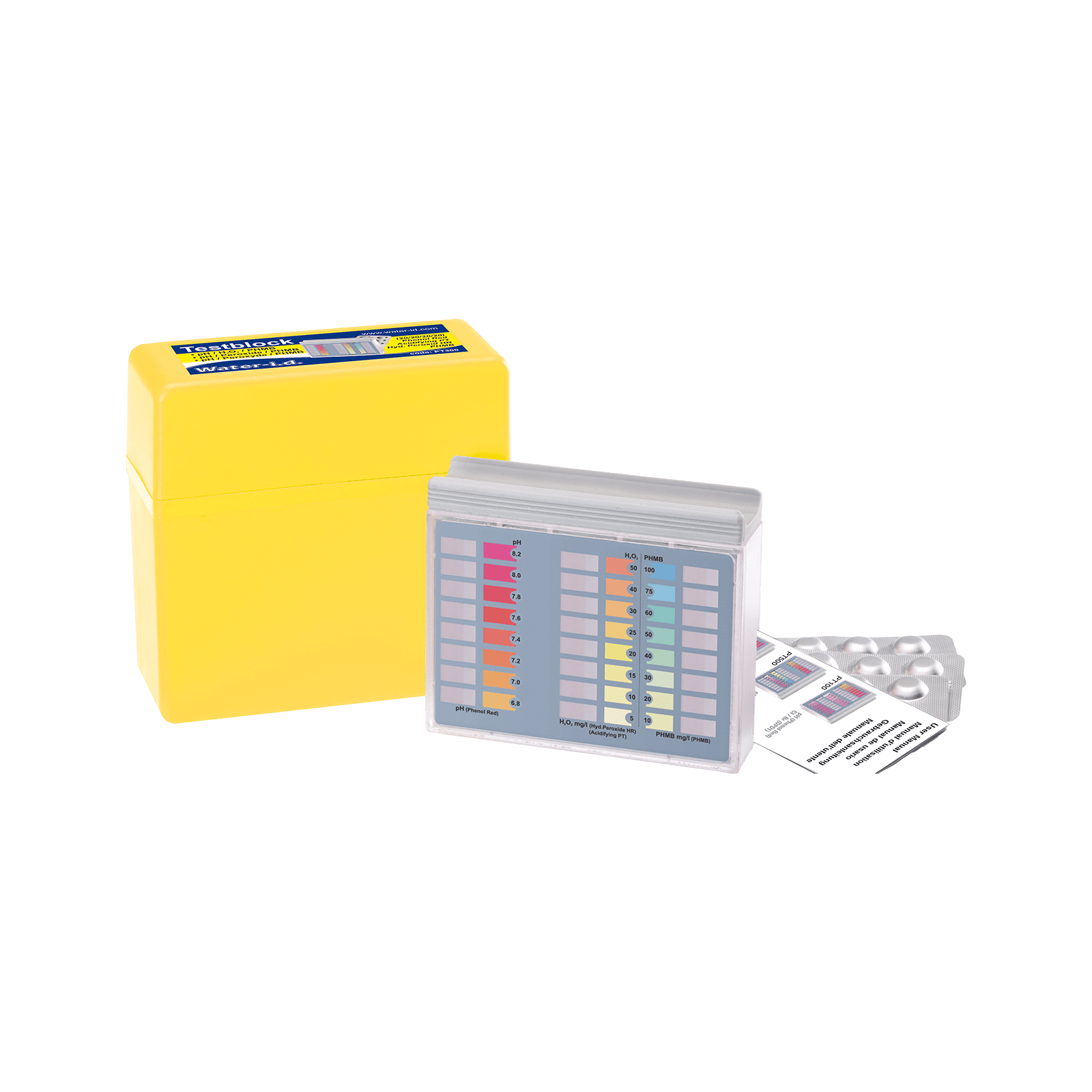 A Pooltester pH, hidrogén-peroxid (H2O2) és polihexametil biguanid (PHMB) méréshez 20-20 darab tablettát tartalmaz.