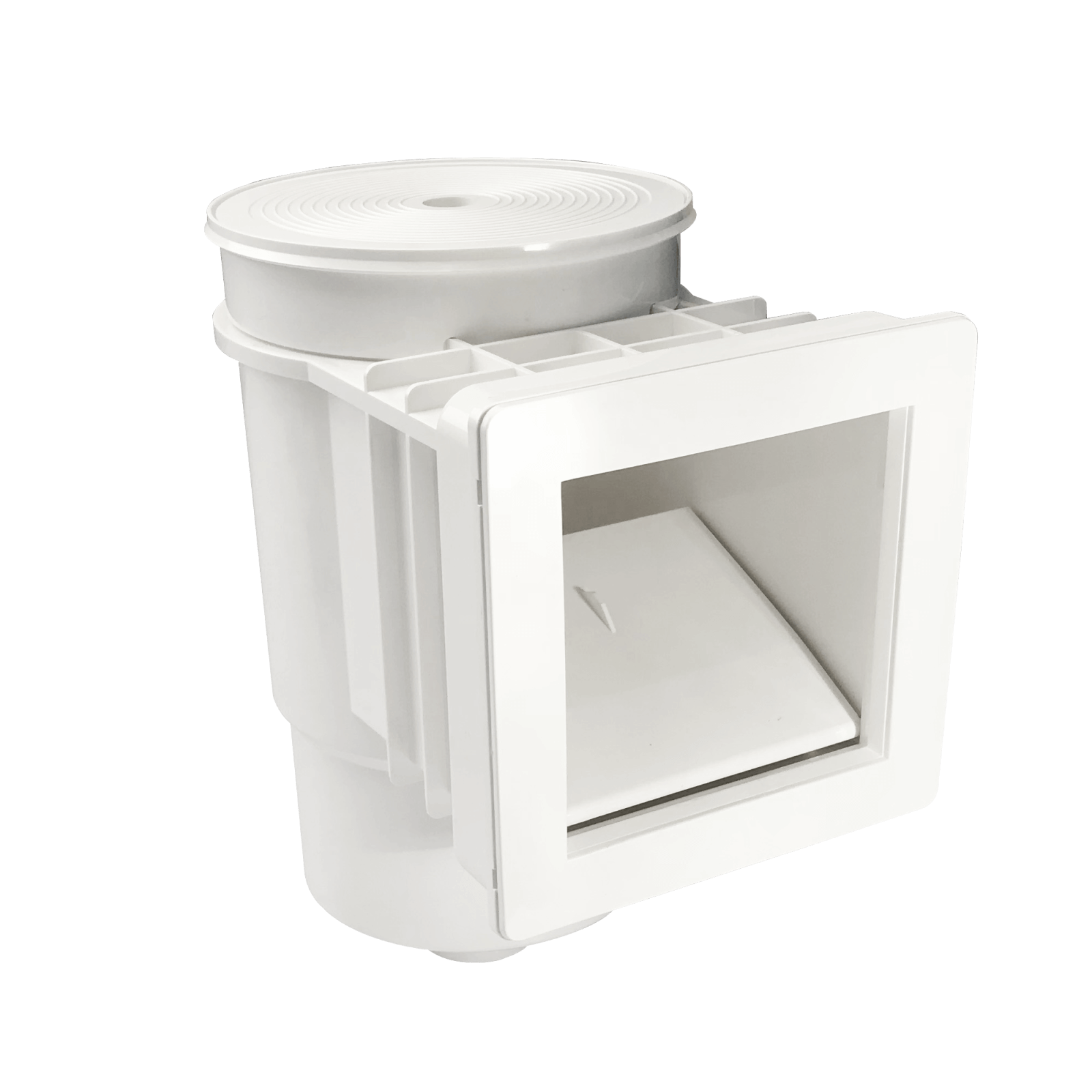 Szkimmer – kiváló megoldás fémfalas és PP medencékhez és minden más kompakt beépítést igénylő medencék esetében. Nagy kapacitású kosárral és többcstornás csatlakozási lehetőséggel.