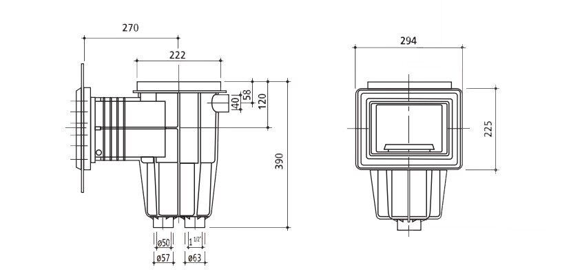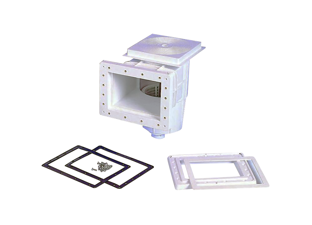 Nagy kapacitású szkimmer fóliás medencéhez. Szkimmer ajtóval és rögzítő mechanizmussal ellátva a szennyeződések visszaáramlása ellen.