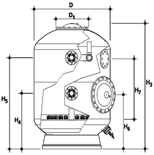 Üvegszál erősítésű MSZ 15236:2013 szabványnak megfelelő tekercselt üvegszál erősítésű szűrőtartály közületi medencékhez, figyelőablakkal, vízgyűjtő tölcsérrel. Tartozéka a nyomásmérő óra és légtelenítőszelep. A szűrőágy szűrőlappal van szerelve.
